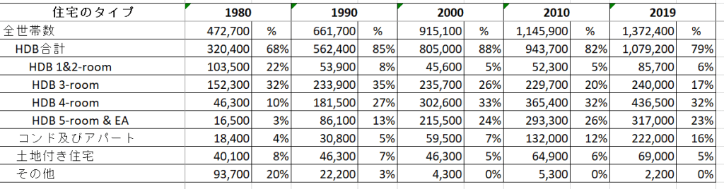 まずシンガポールの世帯数(国民及びPR世帯)ですが、ご覧の様に1980年は47万世帯だったのが、2019年には137万世帯に増えています。そのうちHDBに居住する世帯数は1980年の32万世帯から108万世帯へ増えています。ただ全世帯数に対する割合でみますと2000年に88%とピークになっていますが、現在は79%です。その他コンド及びアパートに居住する世帯数は1980年には18千世帯から2019年には22万世帯へと増えています。全世帯数に対する割合が4%から16%に増加していますので、かなりコンドに住む地元民が増えているといえます。先に説明したようにここには外国人世帯は(つまり就業ビザ等にて居住している人々)は含んでいません。