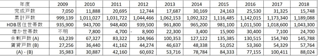 上記は政府統計から取り出したデータ2009年から2018までに完成したHDBの住戸総数をもとに、各年度の供給数を試算しました。各年度によりばらつきがありますが2009年は一番少ない7,050戸、2014年と17年には3万戸を超えています。これと上述のシンガポールのHDB居住世帯数と比較して、余剰戸数を試算してみました。これで計算しますと、14万5千戸(上記表A)もの余剰戸数(12.3%)とかなり高いものとなります。ただ別の統計資料で、HDBの最低居住期間の5年を経て賃貸に出されている物件のデータ(上記表B)をみつけました。この賃貸戸数が全て外国人に賃貸されているのではなくHDB居住世帯と重複している戸数もあるのかもしれません。この辺のデータの明確な定義が示されていませんので実際の余剰戸数が(A) – (B)で算出されているものになるかは定かではありませんが、大まかにはその位と考えてよいのかと思います。この試算方法ですと、2018年のHDBの余剰戸数は88,074(余剰戸数率は7.4%)ということになります。