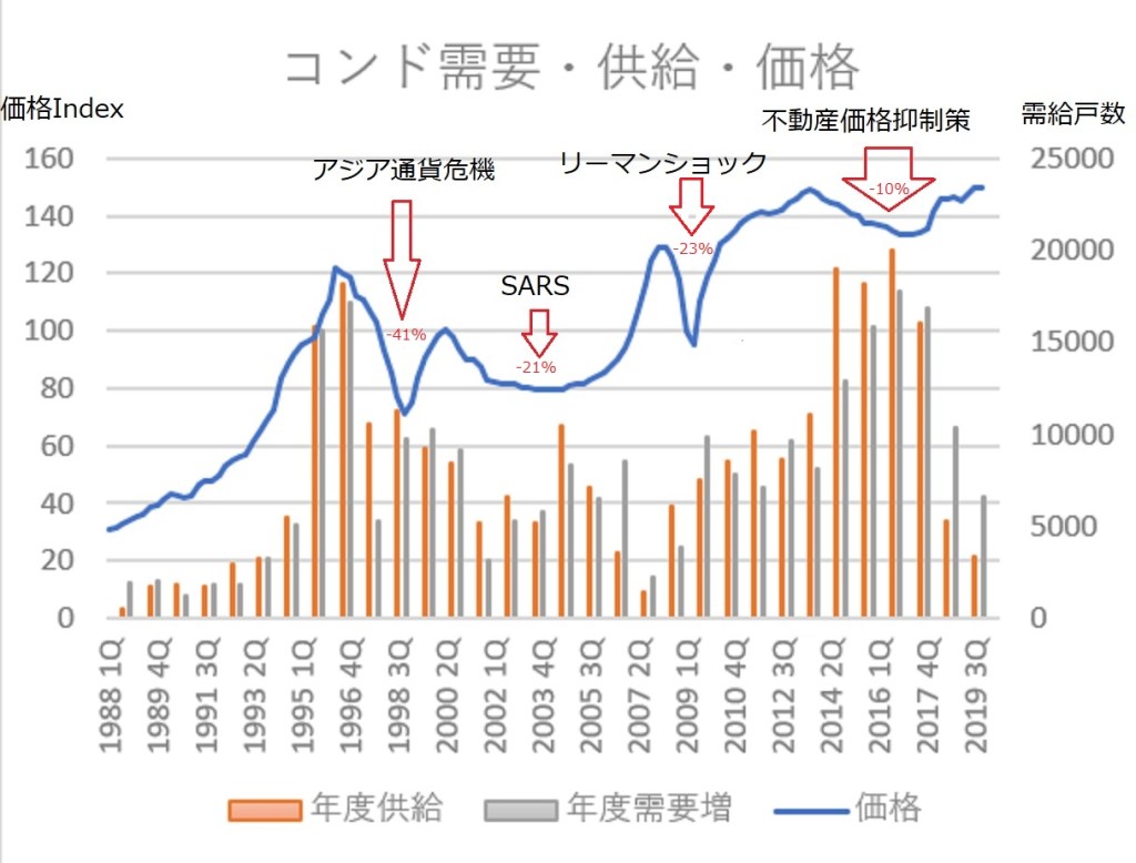 この統計で提供されているのは累供給戸数と空室戸数で、増加戸数は前年度との差額で計算しています。また累計の供給戸数から空き室戸数を差し引き、これから前年度の数字を差し引いて需要(戸数)増を算出してみました。これで見ると累計供給戸数は順調に伸びています。ただ各年の供給数は増減していますが、需要の増減で空き室率が10%以内で推移しています。2019年には5.7%とかなり低くなっています。以下にコンド価格と供給をグラフにしてみました。