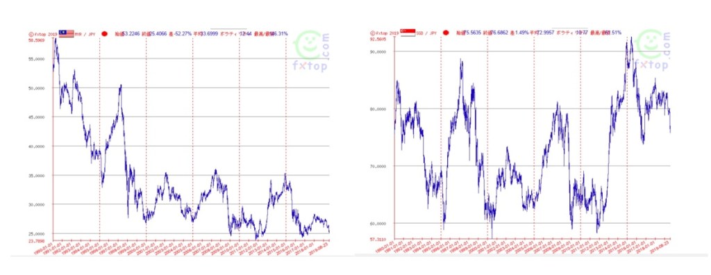 上記はアジア各国の対円レートの1990年から2019年迄の推移です。フィリピンペソは1990年初め対円レート6円でしたが、2019年にはほぼ2円と3分の1となっています。タイバーツは1990年5.6円でしたが、98年アジア通貨危機時には2.3円まで暴落しました。その後盛り返し現在は3.46円と38%減となっています。マレーシアリンギットは1990年初め対円レート53.2円であったのが、2019年には25.4円と2分の1となっています。シンガポールドルは1990年75.5円でした。2000年には57.3円と円高になってはいますが、2016年には92.5円とシンガポールドルは最高値を記録しました。現在は新コロナの影響で76円近辺とほぼ1990年のレベルと同じです。他のアジア通貨とは違い、一定のレンジを行き来するという強みを見せています。少なくともこの期間にアジアの新進国に投資した人達は、たとえ不動産の価格が大きく上がっていたとしても日本円で投資した部分は大きく目減りしたであろうということです。昨今は100%現地通貨で投資する方策もあるるのかもしれませんが、メディアでアジアの新進国が有望と騒がれているからと言って一生懸命働いてためたお金をなんの方策もせずに投資するのは大きなリスクを孕んでいるということを頭に留めておいてください。