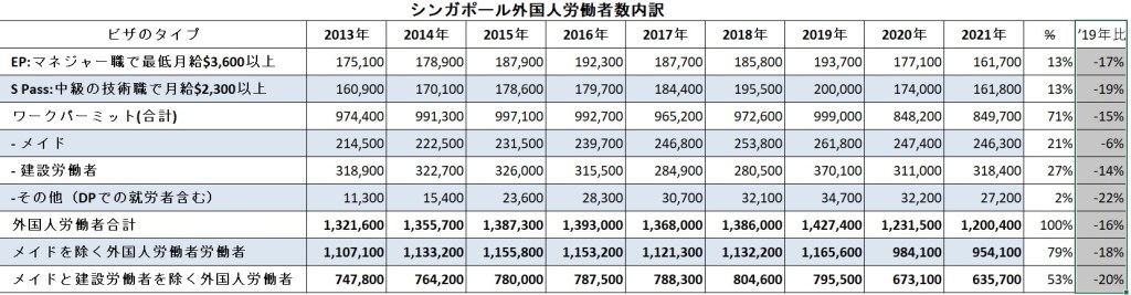 外国人労働者の構成を示しているのが上の表です。2018年度で見ますと外国人労働者の合計は138万人、この中住宅不動産市場にはほとんど関係ないのが、メイド(25万人)と建設労働者(28万人)です。メイドは雇用者宅に居住しますし、建設労働者は最近のコロナの感染で話題になっています労働者用の寮に居住しています。その他のワークパーミット(WP)保持者は約44万人となりますが、これらの人々は飲食店や小売店の店員等割と低賃金の労働者で、多くはHDB(政府開発の分譲アパート)に部屋を数人でシェアーするような形で住んでいる人が多いと思います。Sパス保持者はワークパーミットよりは給料が高いので、独身はHDBもしくはコンドの部屋借り、もしくは数人で1軒をシェア、家族持ちですとHDBの1軒賃貸という人が多いかと思います。そしてエンプロイメント・パス(EP)保持者はHDBもしくはコンドの1軒賃貸が大部分かと思います。今回統計を見直しまして、2019年とコロナ後の2021年で比較しますEP保持者が17%も減少していることに驚きました。というのはこれだけ減っているのに、コンドの賃貸状況は逼迫状態が続いているということです。