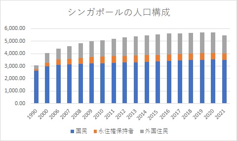 上のグラフはシンガポールの人口構成を示しています。青がシンガポール国民、オレンジが永住権保持者(以下PR: Permanent Residentの略)、グレーは外国人住民です。直近の2021年で見るとコロナの影響で人口は545万人と少なくなっていますが、国民64%、PR9%、外国人27%の割合となっています。コロナ前の2018年で見ると人口は564万人で、構成比は国民62%、PR9%、外国人29%となっていました。見ると明らかに人口増は殆ど外国人が担っていることになります。ただこの外国人の数全体が不動産の賃貸や所有をしているわけではありません。
